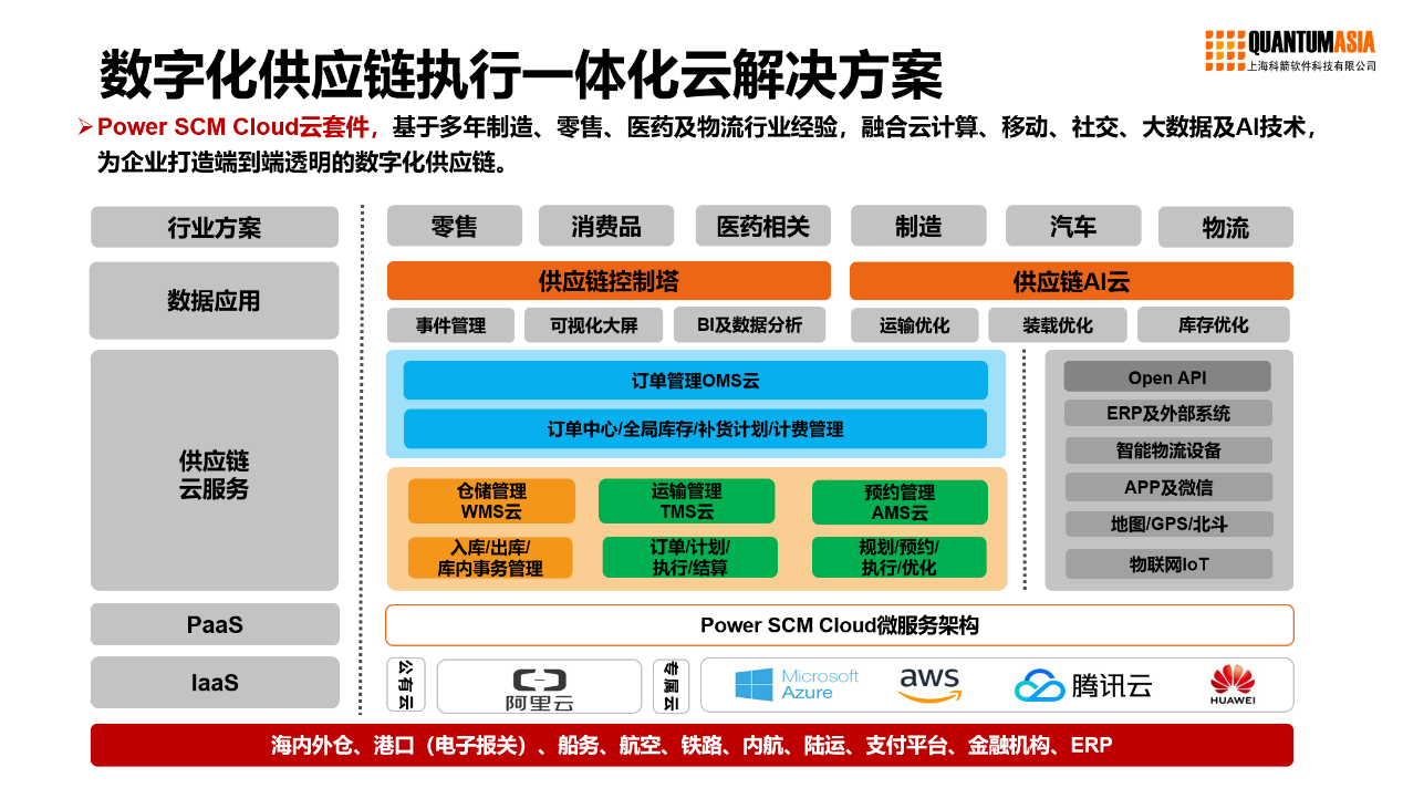 1. 新一代供應鏈信息化平臺的架構更多地會考慮可執行的系統,科箭供應鏈管理云平臺-Power SCM Cloud包含對于全渠道訂單的管理;分發倉配之間的運輸執行;供應鏈協同端的供應商、客戶、經銷商、承運商、司機、藥店、醫院,可以在平臺上作快速的共享和連接;基于供應鏈執行的數據,做供應鏈計劃,包含需求優化、網絡優化、需求預測、庫存網絡預測、運輸優化等等。