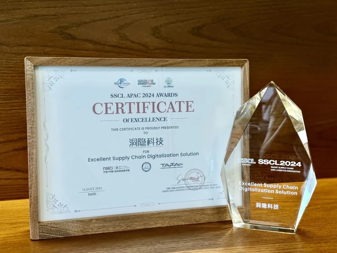 在同期舉辦的2024年度“SSCL金鏈獎(jiǎng)”頒獎(jiǎng)典禮上,洞隱科技憑借出色的產(chǎn)品服務(wù)和顯著的企業(yè)應(yīng)用價(jià)值,獲頒“最佳供應(yīng)鏈數(shù)字化解決方案獎(jiǎng)”。“SSCL金鏈獎(jiǎng)”由來(lái)自行業(yè)協(xié)會(huì)、產(chǎn)業(yè)聯(lián)盟、媒體及咨詢公司等機(jī)構(gòu)的各方專業(yè)人士組成的評(píng)審委員會(huì)討論評(píng)選出各獎(jiǎng)項(xiàng)入圍名單,經(jīng)多輪評(píng)議和投票產(chǎn)生年度獲獎(jiǎng)名單,這也是洞隱科技連續(xù)第二年入選該名單。