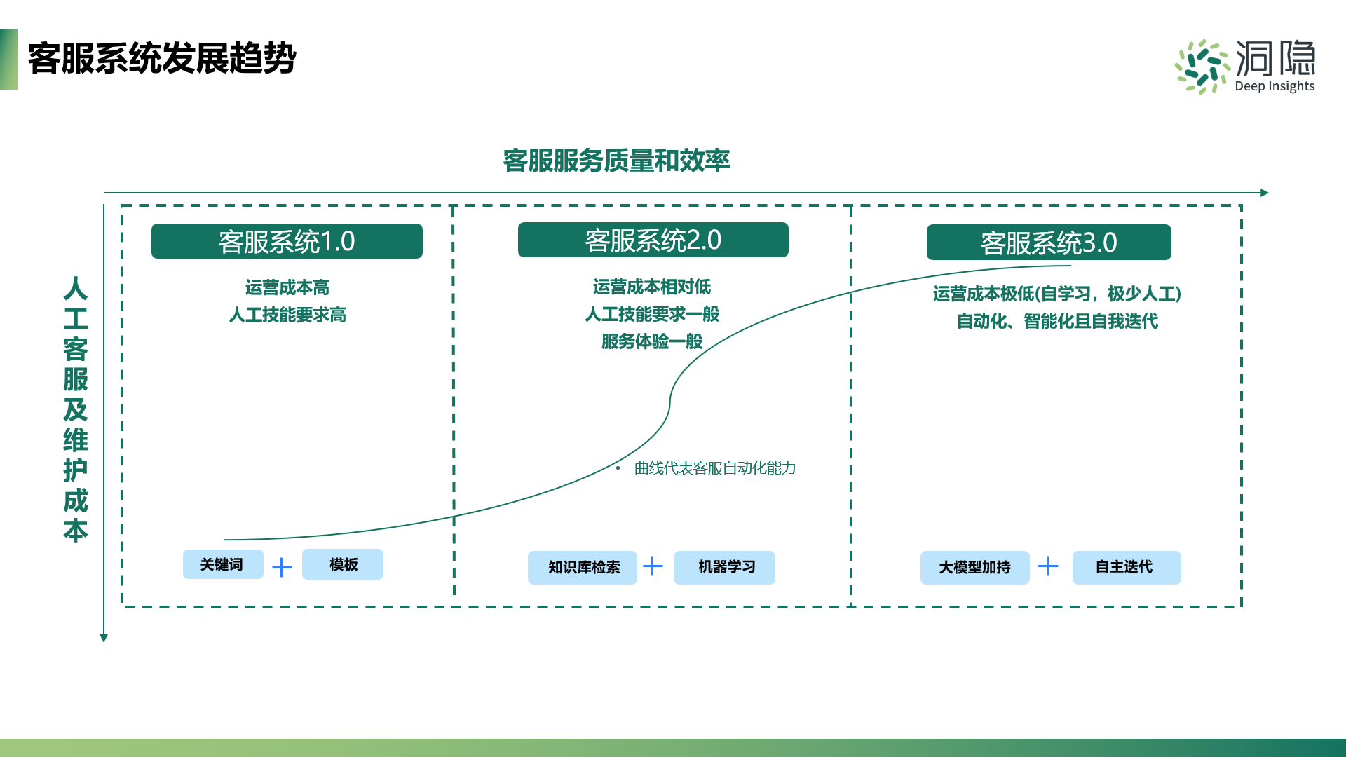 1.0階段是為人工客服提供輔助管理系統工具;2.0階段引入了機器人客服,雖然減輕了人工客服常規服務的工作壓力,但服務體驗比較一般;3.0階段是基于大模型能力的AI客服,注入了強大的自然語言處理能力,顯著提升了其服務質量和效率;并且,AI機器人通過自我學習和迭代,使服務更智能化、人性化。