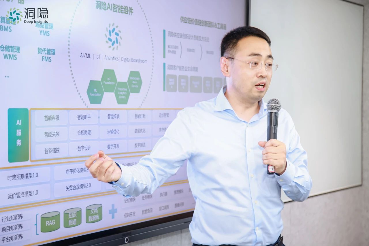 同時,結合大模型能力與垂直行業的knowhow,洞隱推出了供應鏈AI行業大模型,以期逐步實現控商、控貨、控網、控財四大能力的全鏈路增效,為此已場景化地開發了5大應用,分別是智能運輸優化、智能訂艙、智能關務、智能助手及AI開發平臺,為供應鏈智能化轉型提供新的思路和解決方案。