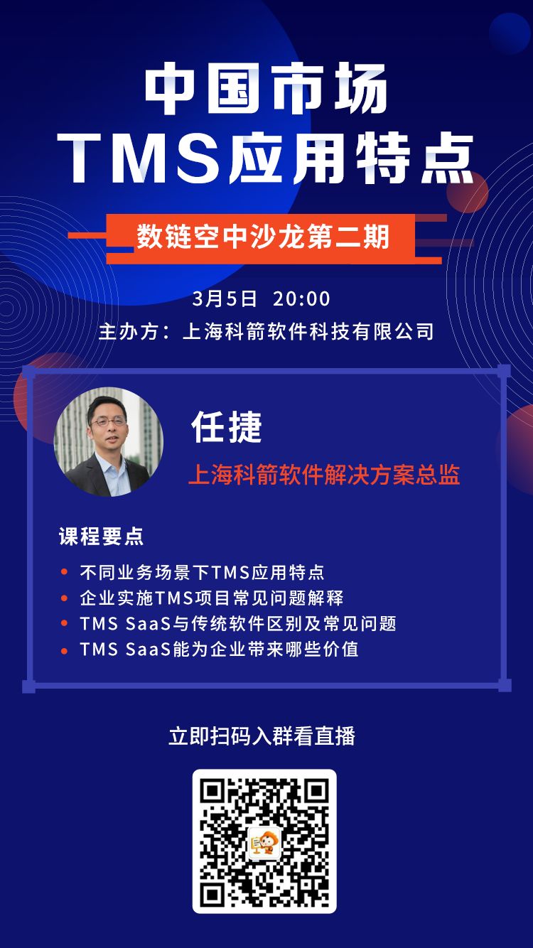 今晚20點整,科箭供應鏈解決方案總監任捷先生將在線為大家詳細介紹科箭TMS云的應用特點及項目價值,歡迎掃碼入群看直播。