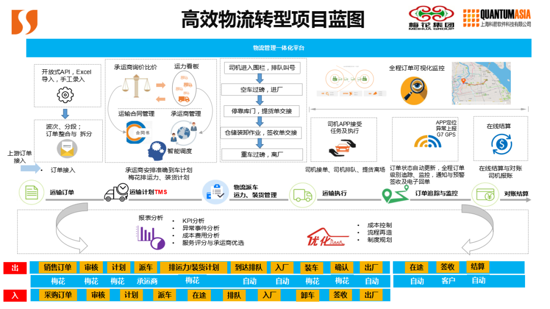 科箭TMS云標準產品和解決方案可完全支持梅花集團對于運輸訂單、計劃、執行、監控和結算的各種業務場景(如:園區預約管理業務),整合上下游系統,實現端到端透明和實時運輸管理。
