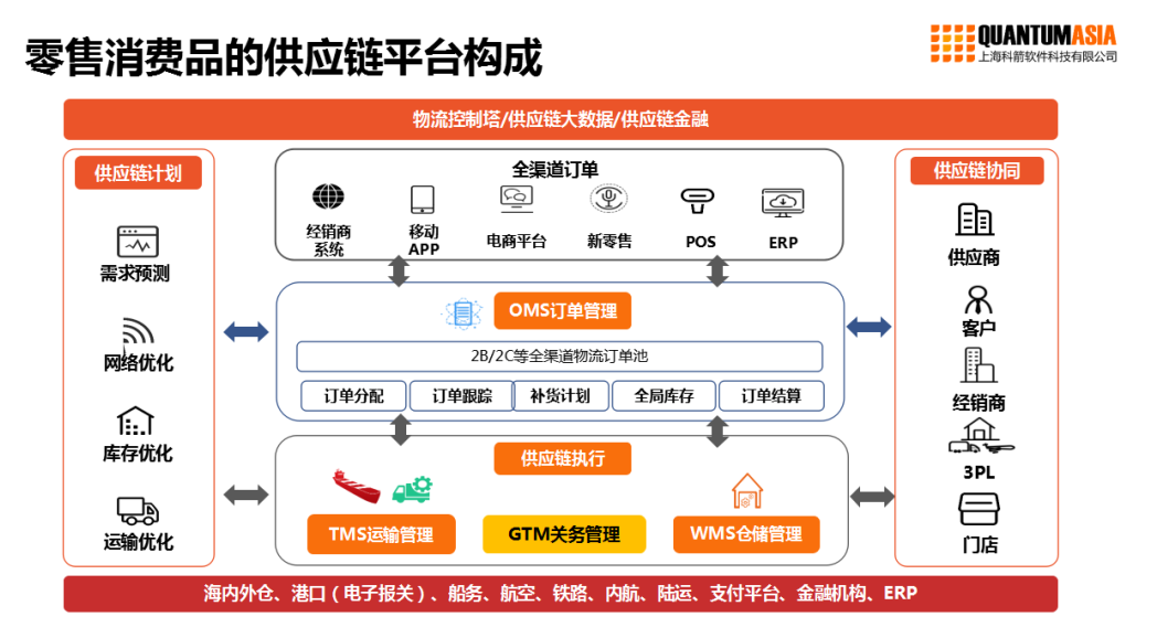 蘭鵬先生介紹了科箭在零售消費品的供應鏈平臺構成。科箭圍繞訂單、倉儲運輸、關務管理等供應鏈執行的系統,服務于全渠道訂單,全渠道平臺還關聯到供應鏈的協同,涉及供應商、客戶、經銷商、第三方物流、承運商、門店等等。在此基礎上,更在供應鏈計劃進行需求預測、網絡優化、庫存優化、運輸優化,這也是在搭建供應鏈平臺中很關鍵的點。科箭還提供了物流控制塔、大數據分析、供應鏈金融等服務,為企業構建敏捷、高效、智能、數字化的供應鏈。