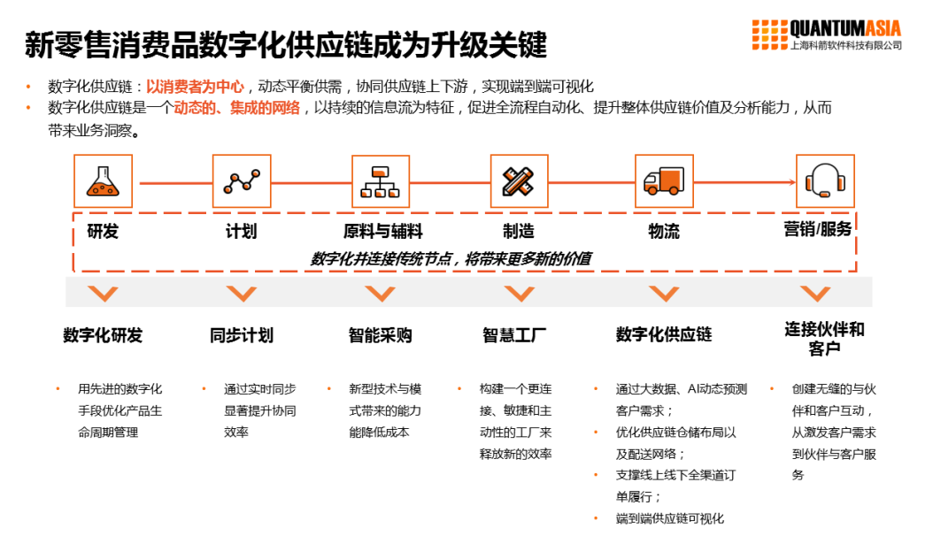 數字化供應鏈可以理解為以消費者為中心,動態平衡供需,協同供應鏈上下游,實現端到端可視化。基于此,新零售消費品數字化供應鏈升級關鍵包括以下幾個方面: