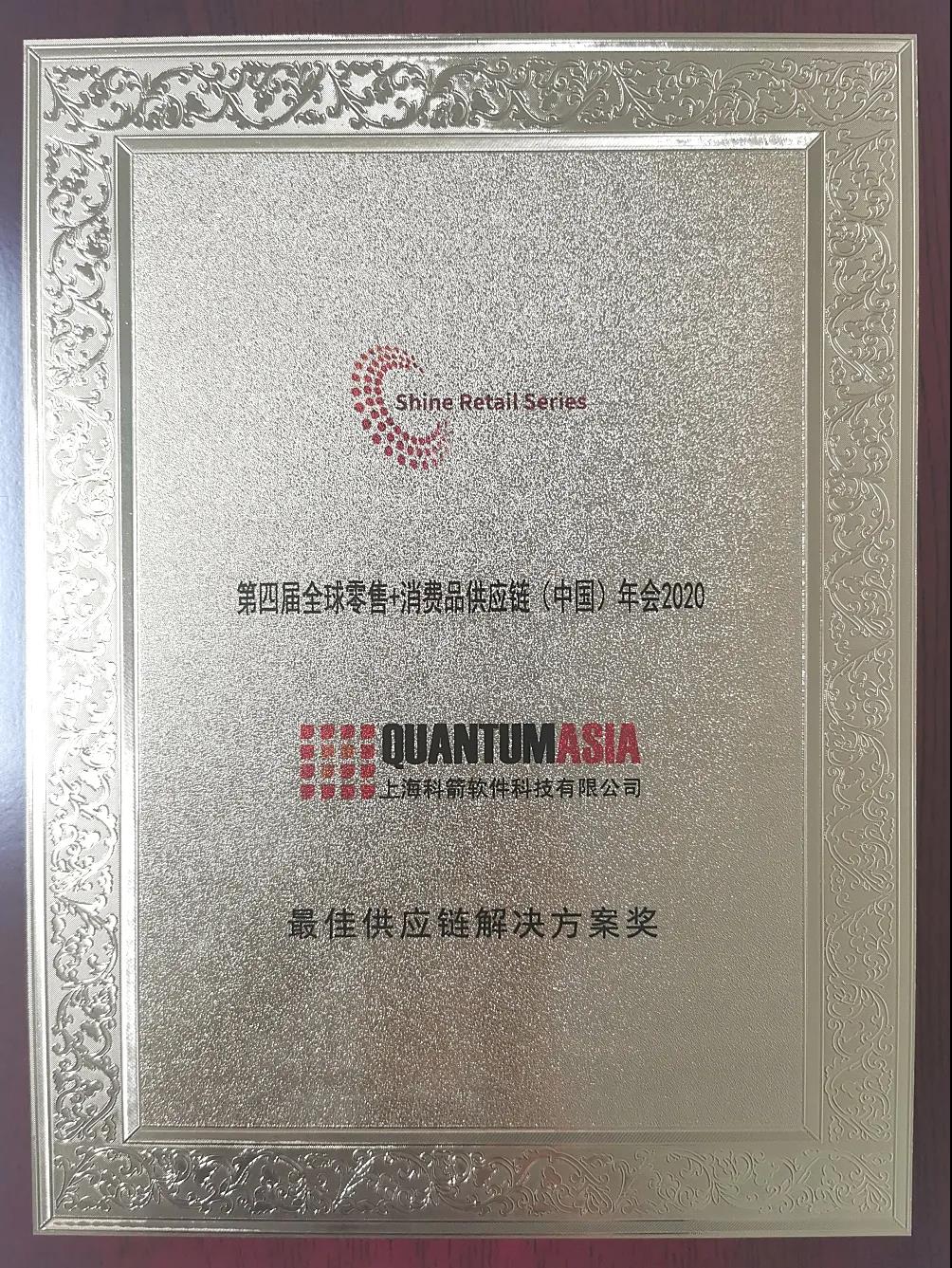 在第四屆全球零售+消費品 (中國) 年會暨年度金鏈獎頒獎盛典上,科箭軟件榮獲“最佳供應鏈解決方案獎”