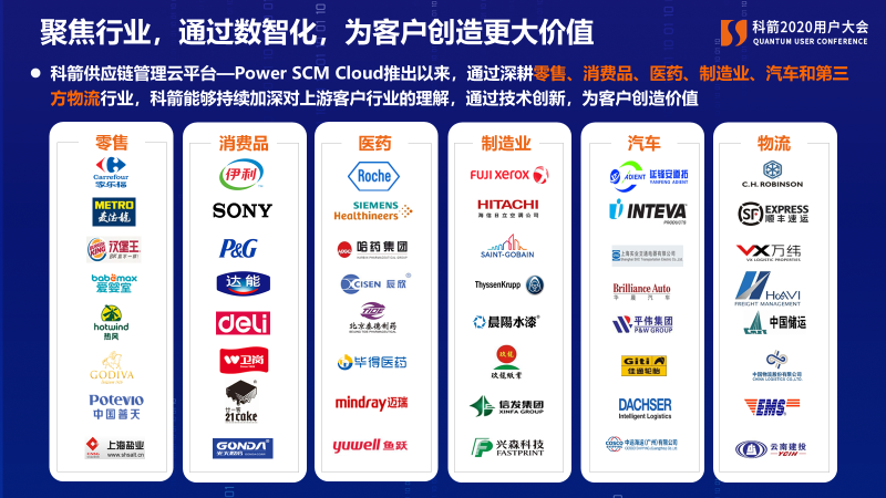 憑借不斷創新的產品、專業的團隊、優質的服務,科箭贏得了眾多客戶的認可。科箭供應鏈管理云平臺—Power SCM Cloud推出以來,已經在家樂福、麥德龍、漢堡王、羅氏醫藥、哈藥集團、伊利集團、延鋒安道拓、富士施樂、普天太力、玖龍紙業及C.H. Robinson、德莎物流、中儲物流等行業領導企業成功應用。通過深耕零售、消費品、醫藥、制造業、汽車和第三方物流行業,科箭能夠持續加深對上游客戶行業的理解,不斷鞏固自己的競爭優勢。