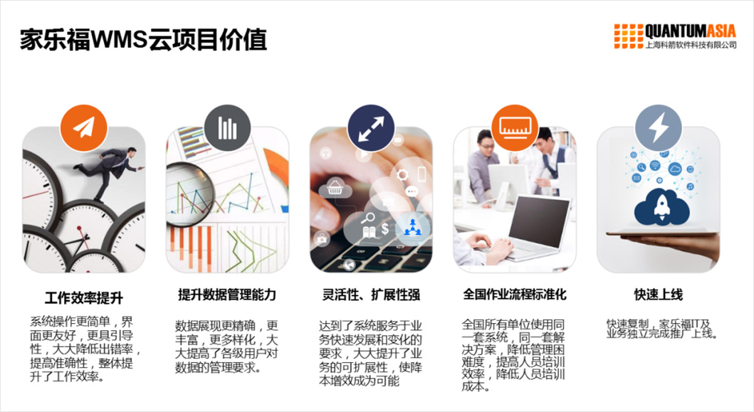 科箭為家樂(lè)福打造的WMS云項(xiàng)目幫助家樂(lè)福實(shí)現(xiàn)了工作效率的提升,數(shù)據(jù)管理能力的提升,具有靈活性、擴(kuò)展性強(qiáng)等特點(diǎn),能夠快速上線(xiàn),實(shí)現(xiàn)全國(guó)作業(yè)流程的標(biāo)準(zhǔn)化,不僅獲得了家樂(lè)福大陸地區(qū)的肯定,家樂(lè)福臺(tái)灣也對(duì)科箭的產(chǎn)品產(chǎn)生了極大的興趣和需求,決定使用科箭全系列產(chǎn)品替代原有的老舊系統(tǒng),除了解決與家樂(lè)福大陸地區(qū)WMS系統(tǒng)存在的同樣問(wèn)題,更好地應(yīng)對(duì)臺(tái)灣地區(qū)門(mén)店數(shù)量和供應(yīng)商更多等棘手問(wèn)題。