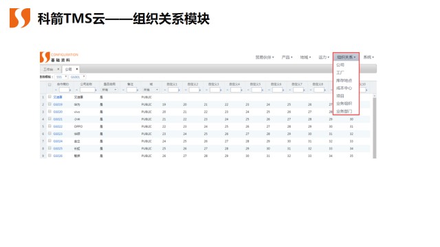 大型的集團(tuán)企業(yè)客戶,除了復(fù)雜的公司層級與組織結(jié)構(gòu)外,需要實(shí)現(xiàn)多維度的業(yè)務(wù)分析與成本控制模型的標(biāo)準(zhǔn)化,對運(yùn)費(fèi)的管理與分?jǐn)傆蟹浅<?xì)致的規(guī)則要求。科箭TMS云為滿足眾多大型客戶的需求,在基礎(chǔ)資料中增加了組織關(guān)系模塊,涵蓋公司、工廠、庫存地、成本中心、項(xiàng)目、業(yè)務(wù)組織、業(yè)務(wù)部分,并完善了組織關(guān)系下這些子模塊的功能,滿足企業(yè)多組度的管理控制與業(yè)務(wù)分析要求。