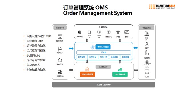 涉及到外部訂單管理,由移動端,社交端,POS機等設備的數據傳輸到系統,通過訂單的組合,實現訂單池的分配、調度、整合,再與倉配系統進行協同,服務于供應鏈的前端與后端。