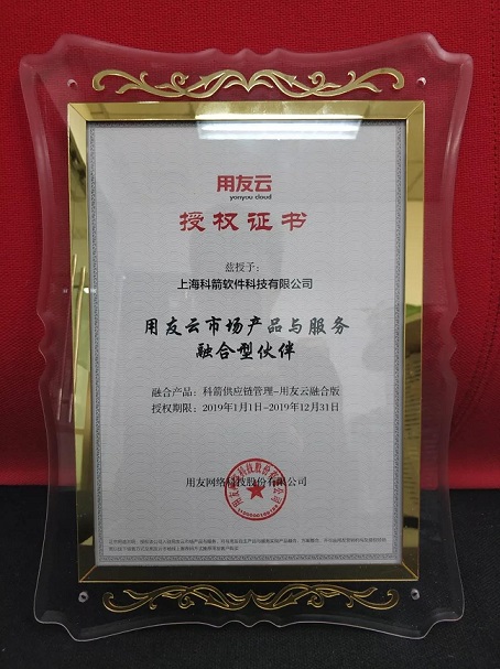 科箭供應鏈管理—用友云融合版獲得用友云授予的授權證書,正式成為用友云市場產品與服務融合型伙伴。