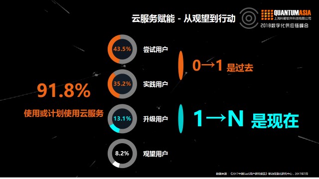 另外一個關鍵就是云服務的賦能,我想今天已經不需要和大家介紹云服務的好處了,來和大家分享一個移動信息化研究中心去年的一個報告,這個調查報告指出從2016年到2017年可以看出使用或者計劃云服務的已經達到91.8%。可以說,物流信息系統是最適合走向云端的應用,不論是從網絡化特征或者叫外部性的角度,還是從數據的敏感度或者數據安全性的角度看,都是最適合走向云端的所以云端的物流信息系統給大家帶來的更多的是價值而不是風險,這種價值,體現在“天下武功唯快不破”。