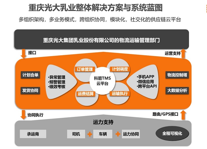 針對(duì)光大乳業(yè)乳品冷鏈物流全程管理與監(jiān)控改造的項(xiàng)目需求,科箭“四管齊下”,為光大乳業(yè)打造了多組織架構(gòu),多業(yè)務(wù)模式,跨組織協(xié)同,模塊化、社交化的供應(yīng)鏈執(zhí)行云平臺(tái),構(gòu)建了完善的系統(tǒng)藍(lán)圖和整體解決方案。