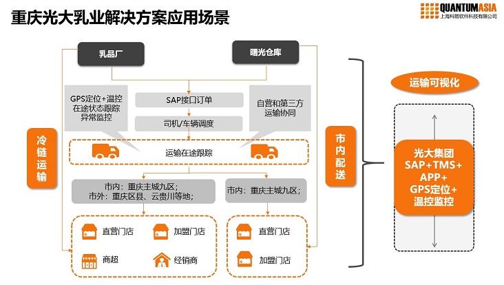 基于科箭最佳實(shí)踐的快速實(shí)施策略,實(shí)現(xiàn)了TMS云系統(tǒng)在光大乳業(yè)的多家工廠快速上線,形成生產(chǎn)力,打造出光大乳業(yè)的運(yùn)輸可視化平臺(tái)——SAP+TMS云+APP+GPS定位+溫控監(jiān)控。