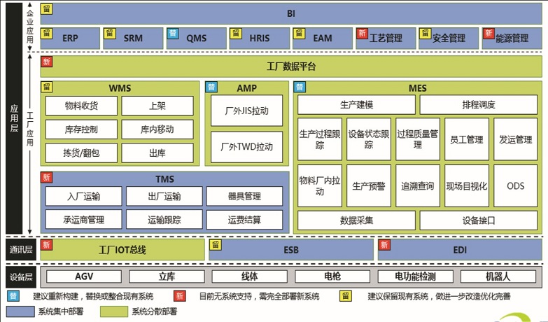 2018年初, 為了向智能制造、智能工廠轉型,延鋒安道拓一方面優化改進現有信息系統,另一方面結合企業發展所需,全面規劃出未來工廠整體信息應用架構藍圖(見圖1),包括生產制造執行系統、物料拉動系統、工藝過程管理、設備管理、質量管理、運輸管理(TMS)六大系統11個子系統。