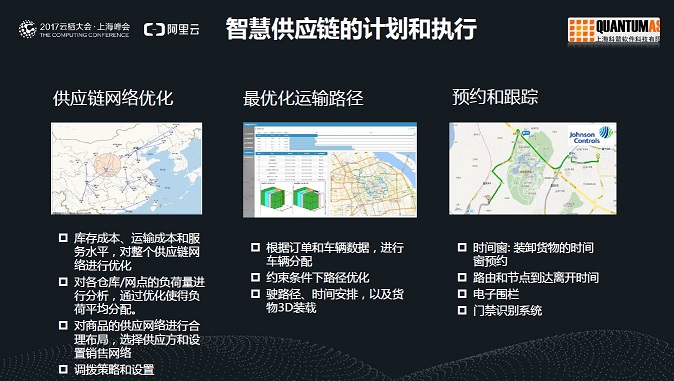 在本次云棲大會中,上海科箭軟件科技有限公司行業供應鏈總監金鳴先生作了《迎接供應鏈云服務時代的到來》的演講,他詳細介紹了科箭在為客戶提供供應鏈解決方案的實踐,以及與阿里云結合下打造的智慧供應鏈所能帶來的價值。如在供應鏈執行中,通過對數據的“洞見”可以選擇更優的倉庫位置,進行供應鏈網絡的合理布局;根據訂單、車輛數據進行車輛分配優化及行車路徑優化等等,最終降低庫存和運輸成本,實現整個供應鏈網絡的優化。