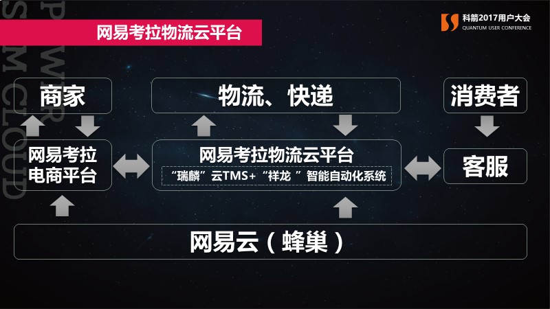 基于以上思考我們與科箭一起聯合打造了“瑞麟”TMS云平臺,再加上“祥龍 ”智能自動化系統,構成了網易考拉的物流云平臺?;诰W易云把網易考拉平臺上的商家、用戶、消費者、客服、快遞無縫連接,整個訂單履約環節做得更清晰更明確。