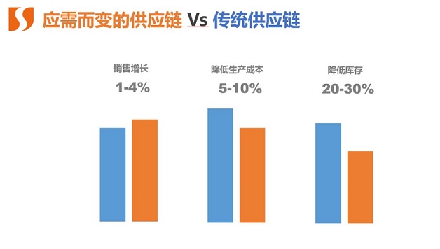 數字化供應鏈提供隨時在線(Always-On)的服務,通過集成各種來源的數據,進行實時獲取與分析,更好支撐企業前瞻性的決策,從而帶來業務收益。隨時在線供應鏈與傳統供應鏈相比能提升銷售1-4%,降低生產成本5-10%,降低庫存20-30%。