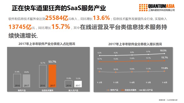 隨著協同、辦公、HR、營銷等SaaS產品被越來越多中國企業所接受,SaaS成了一些軟件巨頭的重大轉型戰略,成了眾多資本追捧的對象,成了企業數字化轉型的標配。從工業和信息化部發布的數據中我們可以看到,SaaS類產品2017年比前一年同比增長15.7%,是相比傳統軟件,嵌入式軟件等產品中增速最快的。
