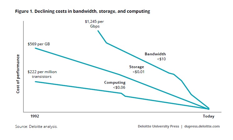 隨著云技術的成熟,其擁有成本也在不斷下降,在德勤分析中可以看到不論從帶寬、存儲、大數據計算上,經過20多年的發展,價格在不斷下降,從92年每GB存儲空間 US$569到現在小于1美分,都說明了云技術的成熟及其可用性不斷增加。