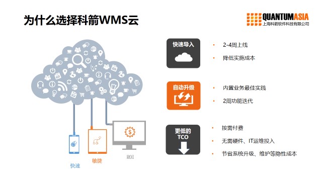 與本地部署的WMS軟件相比,WMS云實施更簡單更快,按需付費的訂閱模式使企業能快速獲得投資回報。科箭 WMS云用戶的實施周期短的只需2周時間即可快速上線。