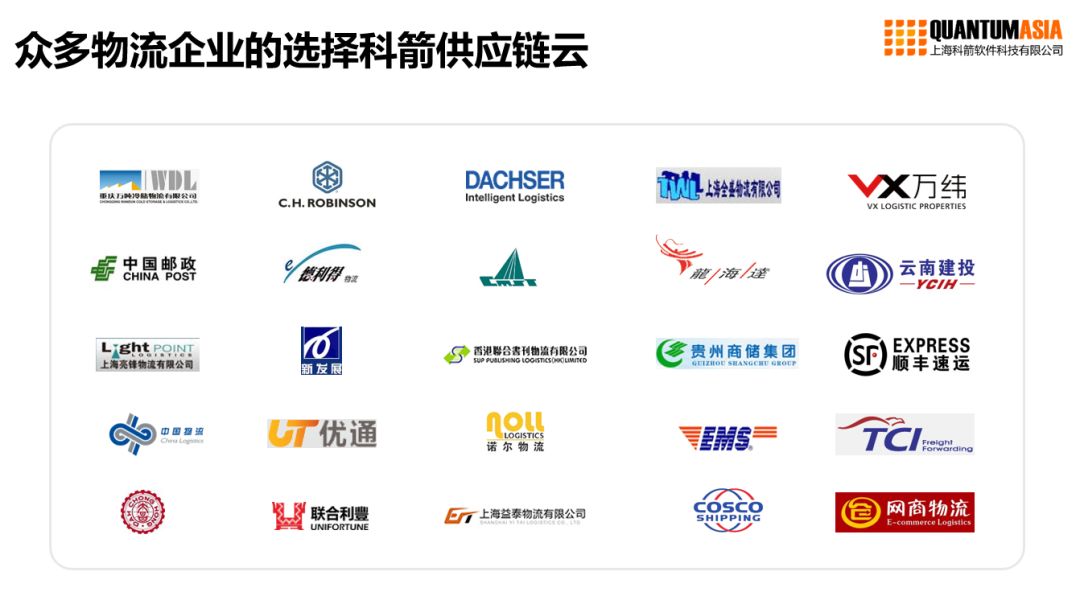 科箭在供應鏈領域深耕16余載,系統(tǒng)內置了很多行業(yè)業(yè)務的最佳實踐,其專業(yè)的團隊也獲得了客戶的高度認可,在三方物流領域積累了眾多行業(yè)領先客戶,如萬緯冷鏈、云南建投、中遠海運、德利得、諾爾物流、德莎物流、美國最大的無車承運人C.H.Robinson等。